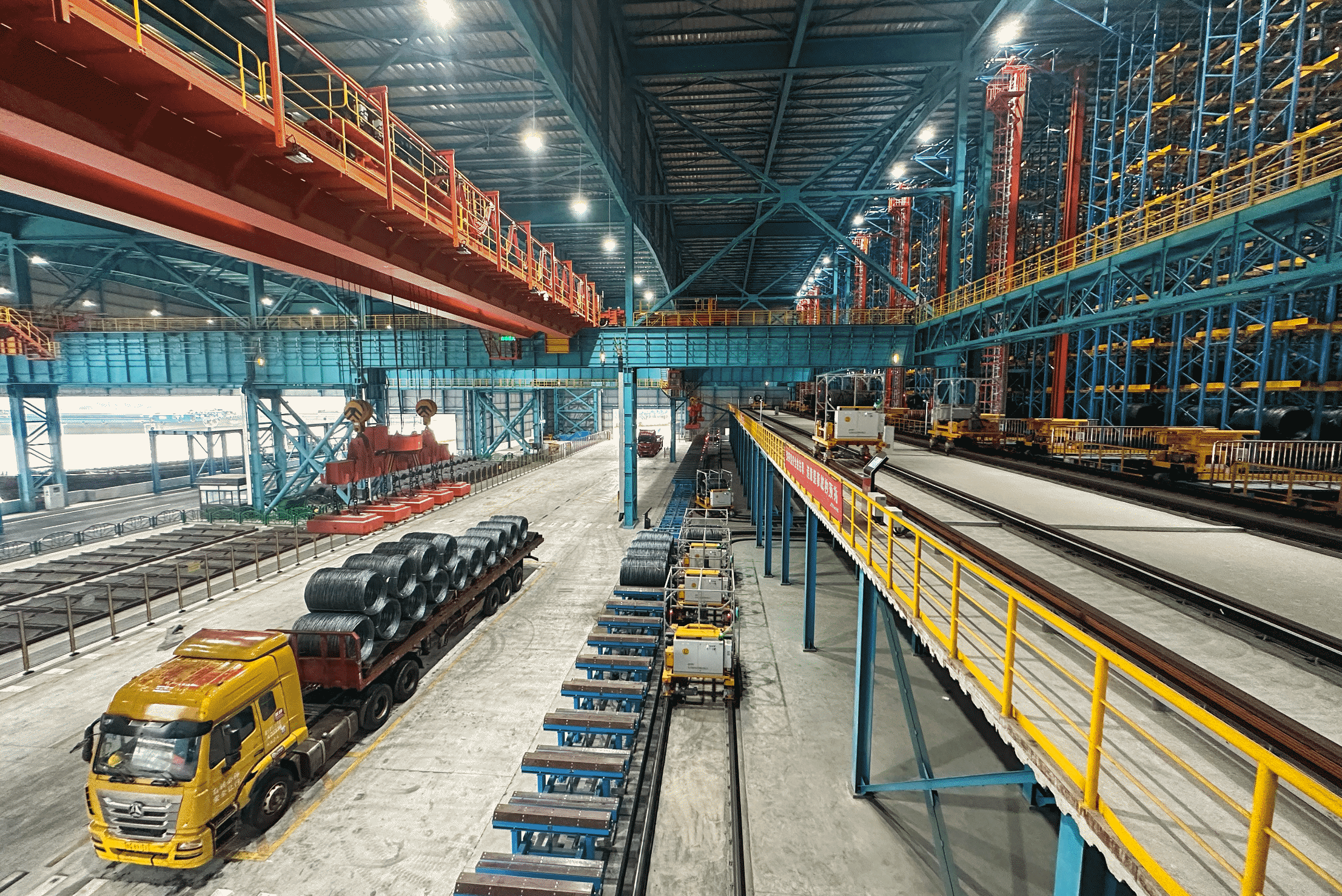 江蘇永鋼精品線材智能服務平臺項目的立體庫具備卓越的自動化和智能化能力。它能同時全自動對接2條盤條生產線,并通過車運方式靈活對接另外3條生產線。此外,該立體庫還配備了6個無人自動裝車月臺和2個裝船碼頭,確保高效運作。在作業效率方面,每小時的出入庫量高達510卷,且能實現24小時不間斷作業。在裝載能力上,單日裝車能力超過0.8萬噸,單日裝船能力超過0.3萬噸。